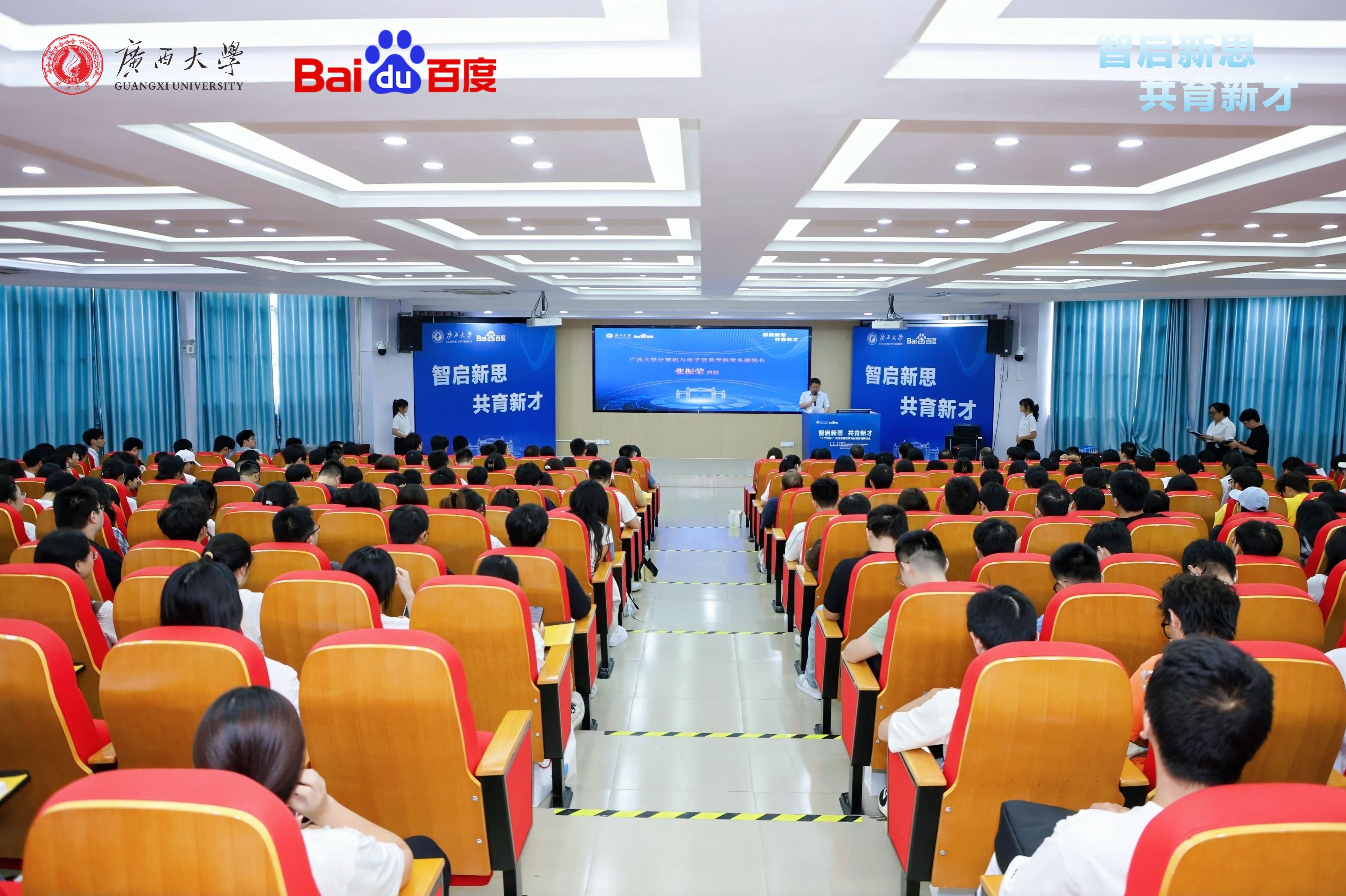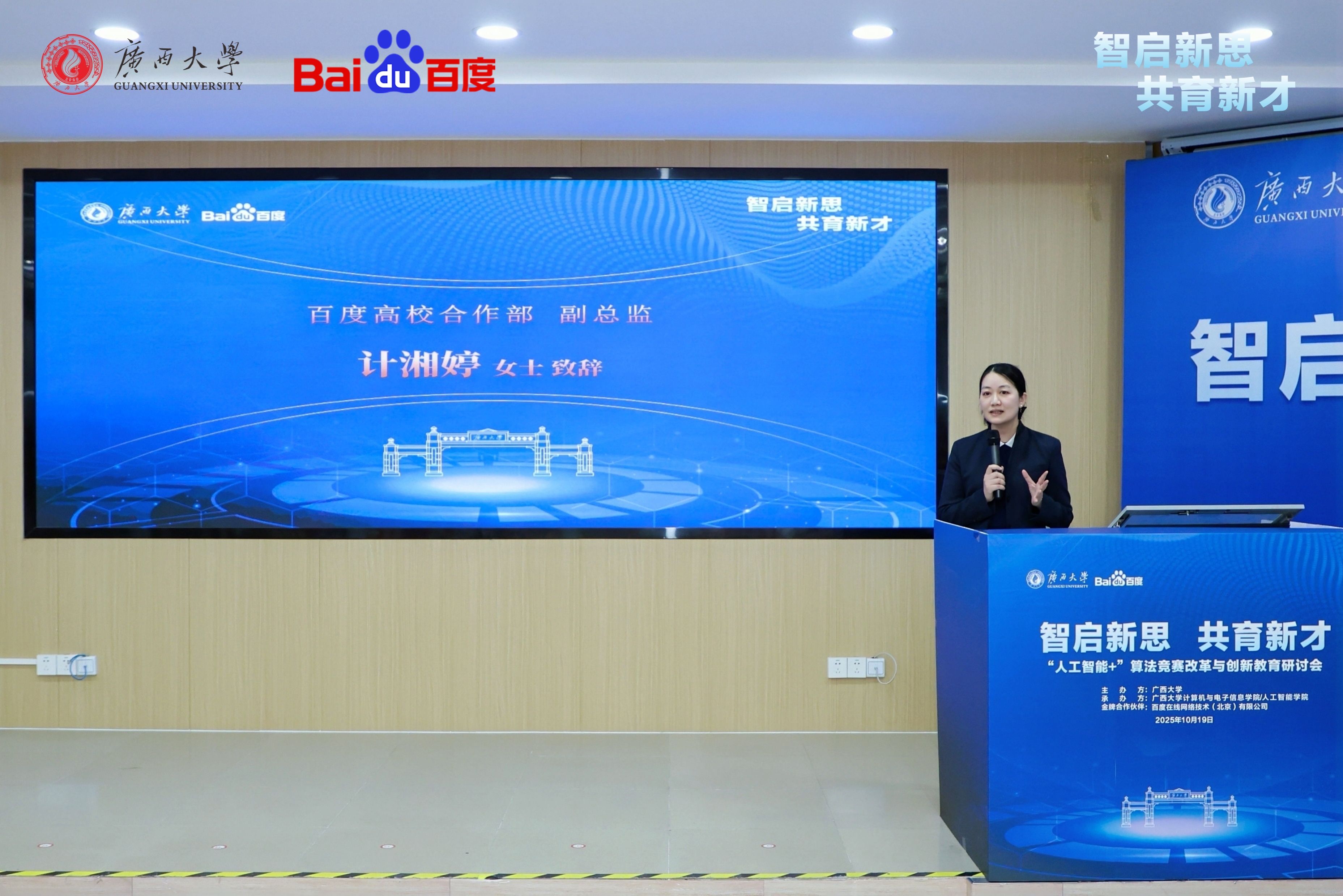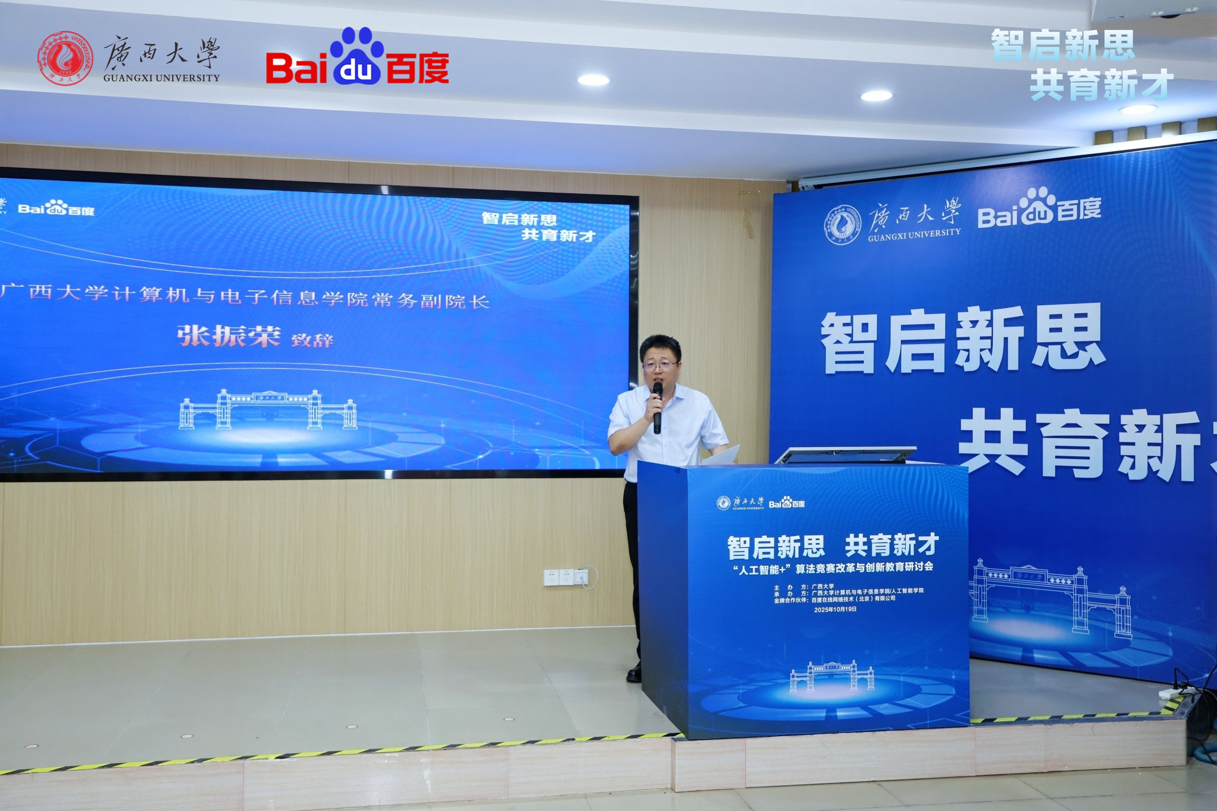 2025年10月19日,广西大学-百度集团“人工智能+”算法竞赛改革与创新教育研讨会在我院召开。研讨会以“智启新思 共育新才”为主题,汇聚多方专家,共同探讨人工智能时代下的人才培养路径。