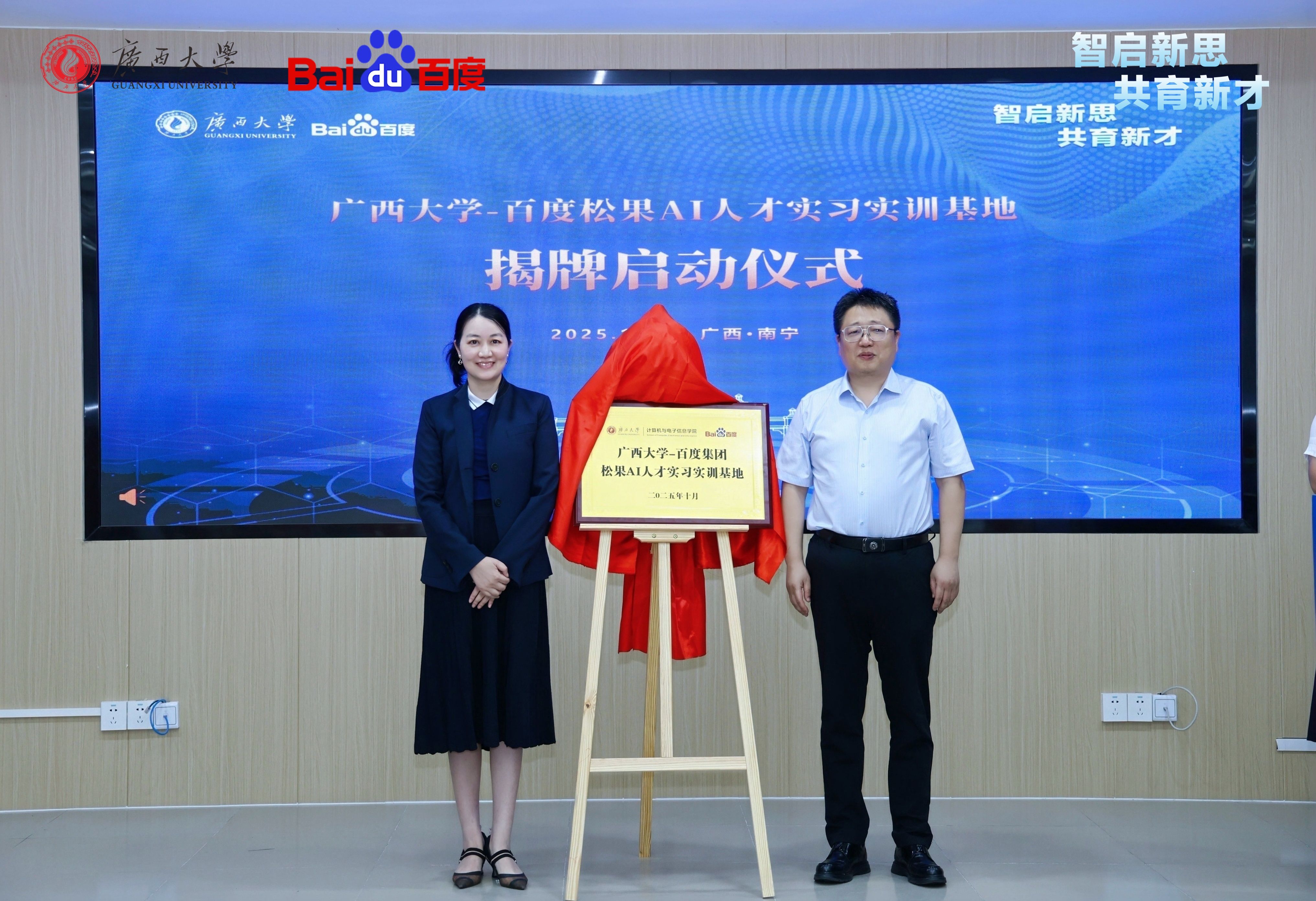 双方围绕把握人工智能时代机遇、深化校企合作、推动学科建设与创新能力提升等议题进行了深入交流。期间,“广西大学-百度集团松果AI人才实习实训基地”正式揭牌,标志着双方在人工智能人才培养领域的合作进入新阶段。
