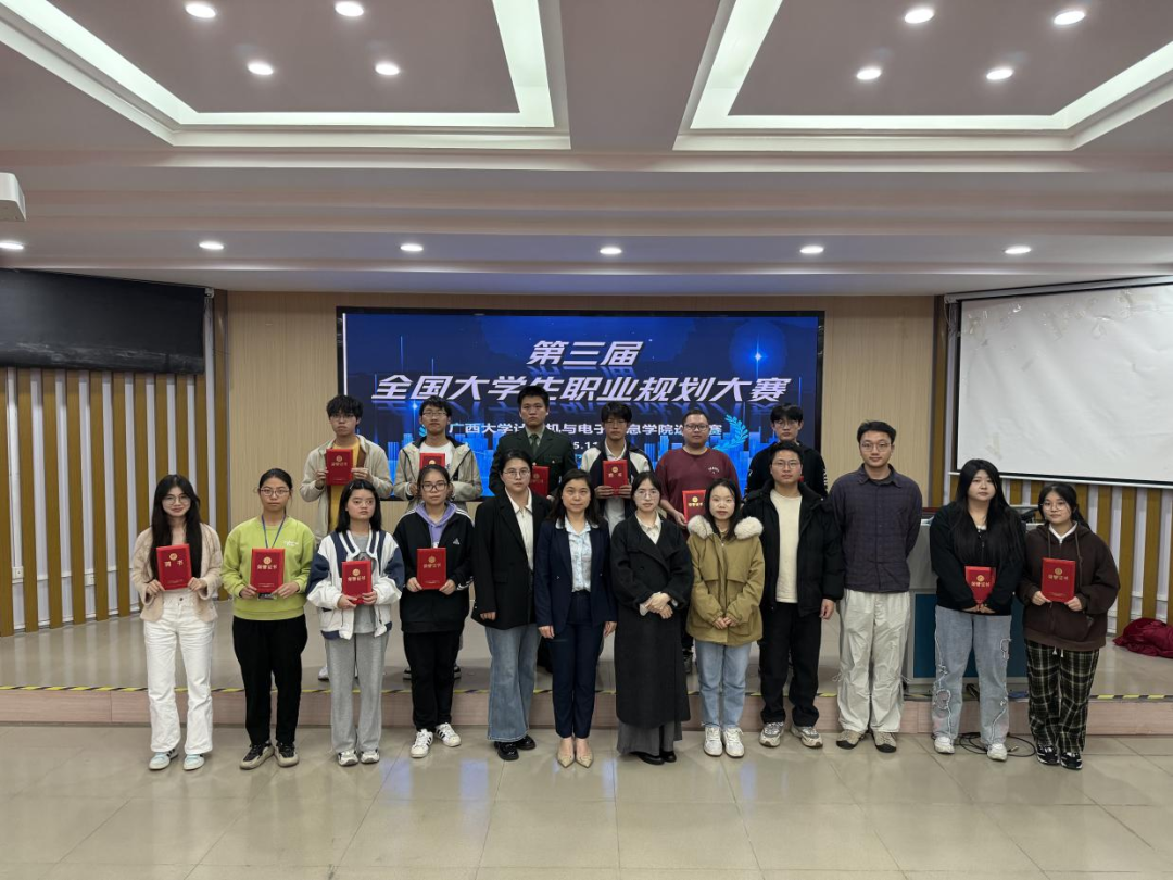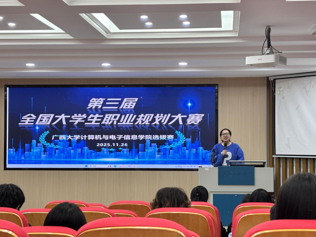 为了加强高校生涯教育和就业指导,增强大学生职业规划意识,促进高质量充分就业,2025年11月26日晚,我院在214报告厅举办了第三届全国大学生职业规划大赛计算机与电子信息学院选拔赛。本次出席大赛的评委有:学院团委书记杨洋老师,辅导员林文潮老师、龙紫璐老师、黄千芊老师,潘秋香老师,以及兼职辅导员胡澎搏。