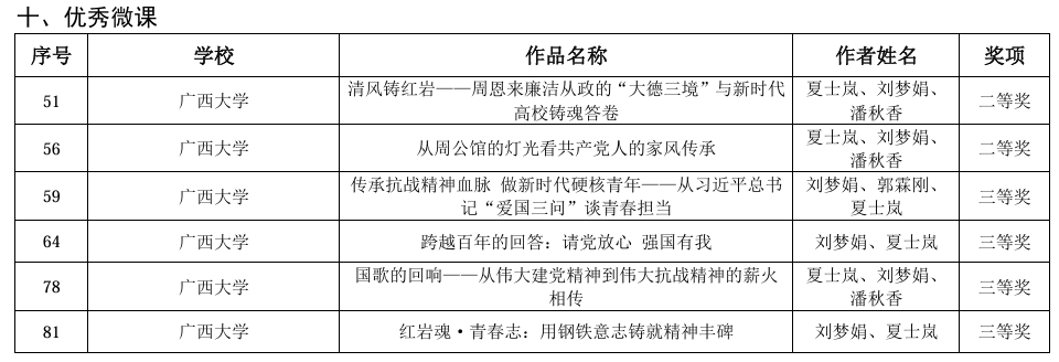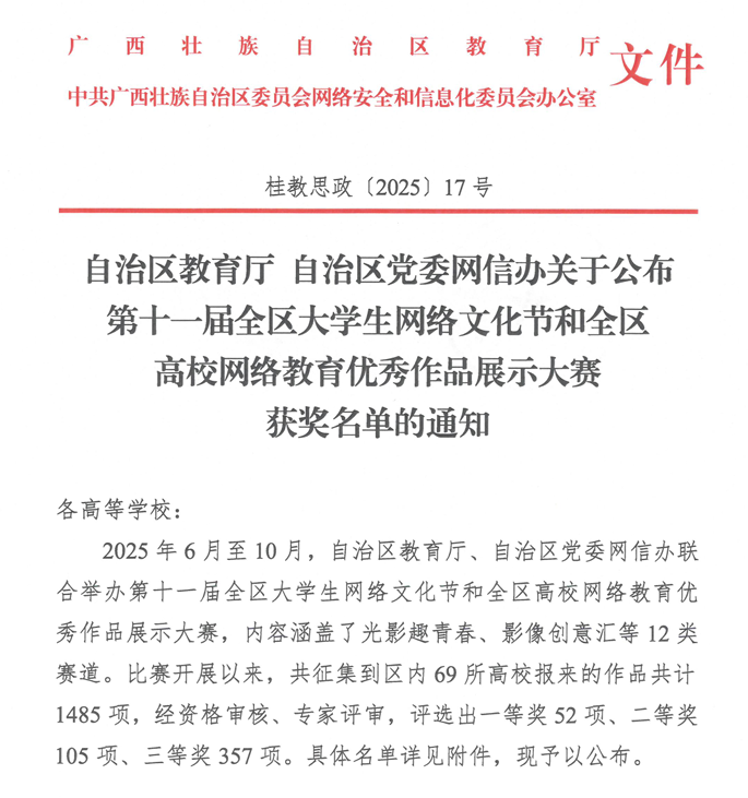 近日,自治区教育厅与党委网信办公布第十一届全区大学生网络文化节和网络教育优秀作品展示活动获奖名单。我院党委高度重视此次赛事,在光影趣青春、优秀微课、优秀新媒体作品3个赛道的征集中,计算机与电子信息学院共有 8 项作品获奖,其中一等奖 1 项、二等奖 3 项、三等奖 4 项,覆盖大学生网络文化创作与高校网络教育优秀作品两大领域,充分展现了我院在网络思想政治教育和校园网络文化建设方面的丰硕成果。
