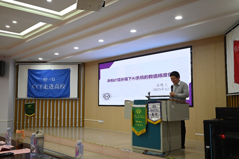 2025年12月19日下午,中国计算机学会(CCF)系统软件专委会走进广西大学,并在计算机与电子信息学院成功举办“人工智能时代计算机学科发展与科技创新机制研讨会”。本次会议由中国计算机学会主办,CCF系统软件专委会,广西大学计算机与电子信息学院,CCF南宁,广西智能数字服务技术创新中心,广西高校并行分布与智能计算重点实验室共同承办,由广西大学计算机与电子信息学院研究生会、CCF广西大学学生分会协办。会议汇聚了来自北京大学、南京大学、华中科技大学等多所顶尖高校的知名学者,共同为在场师生呈现了一场聚焦前沿科技与学科发展的学术盛宴。