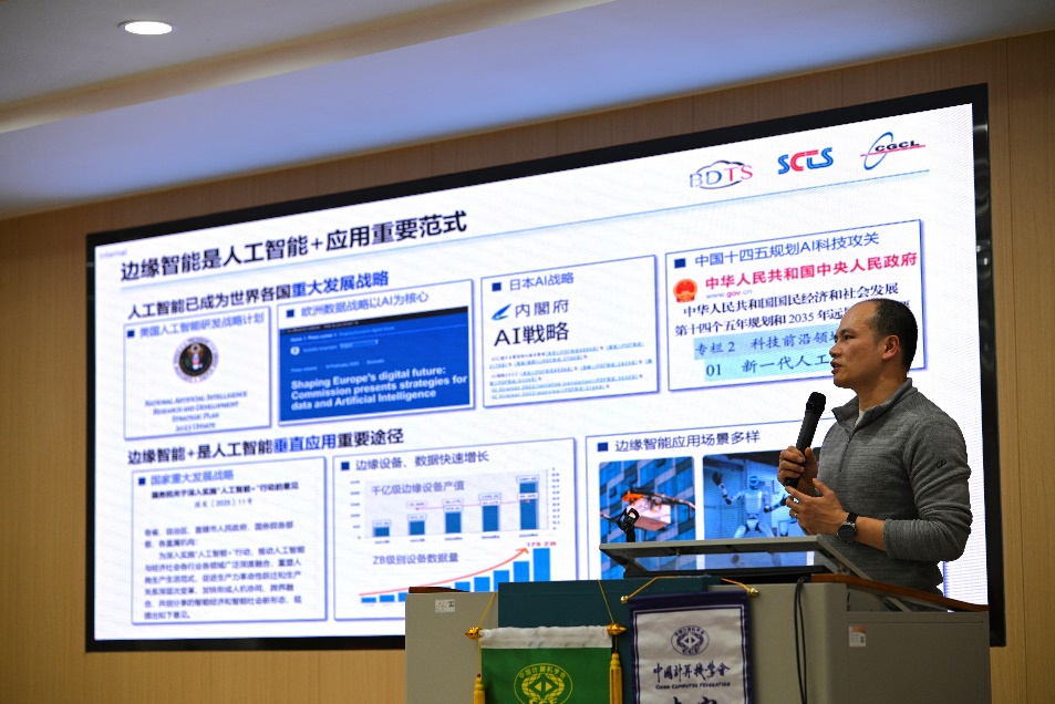 华中科技大学何强教授带来了题为《算力网赋能端侧模型训练:边缘问题边缘解决》的精彩报告。何强教授聚焦于边缘计算这一前沿领域,探讨了如何利用边缘算力帮助终端设备进行模型训练。