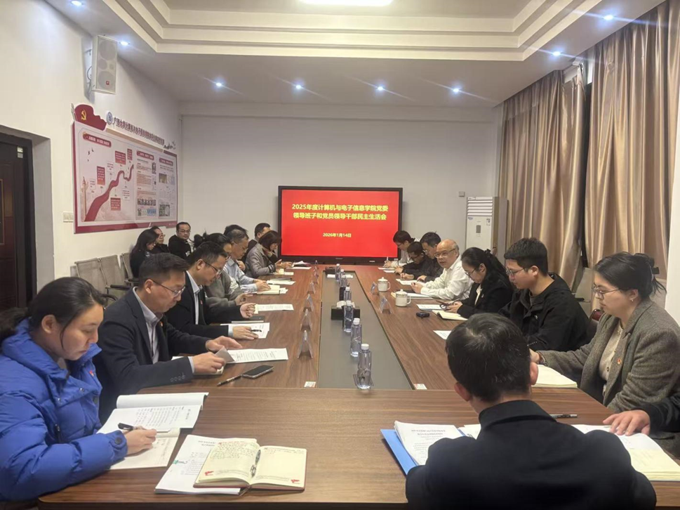 2026年1月14日,计算机与电子信息学院党委在学院213会议室召开2025年度民主生活会,院党委书记赵进创主持会议。校党委常委、副校长梁恩维参加会议并作点评讲话。学院常务副院长张振荣、党委办公室、校长办公室副主任文静、学院党委专职组织员、各党支部书记列席会议。