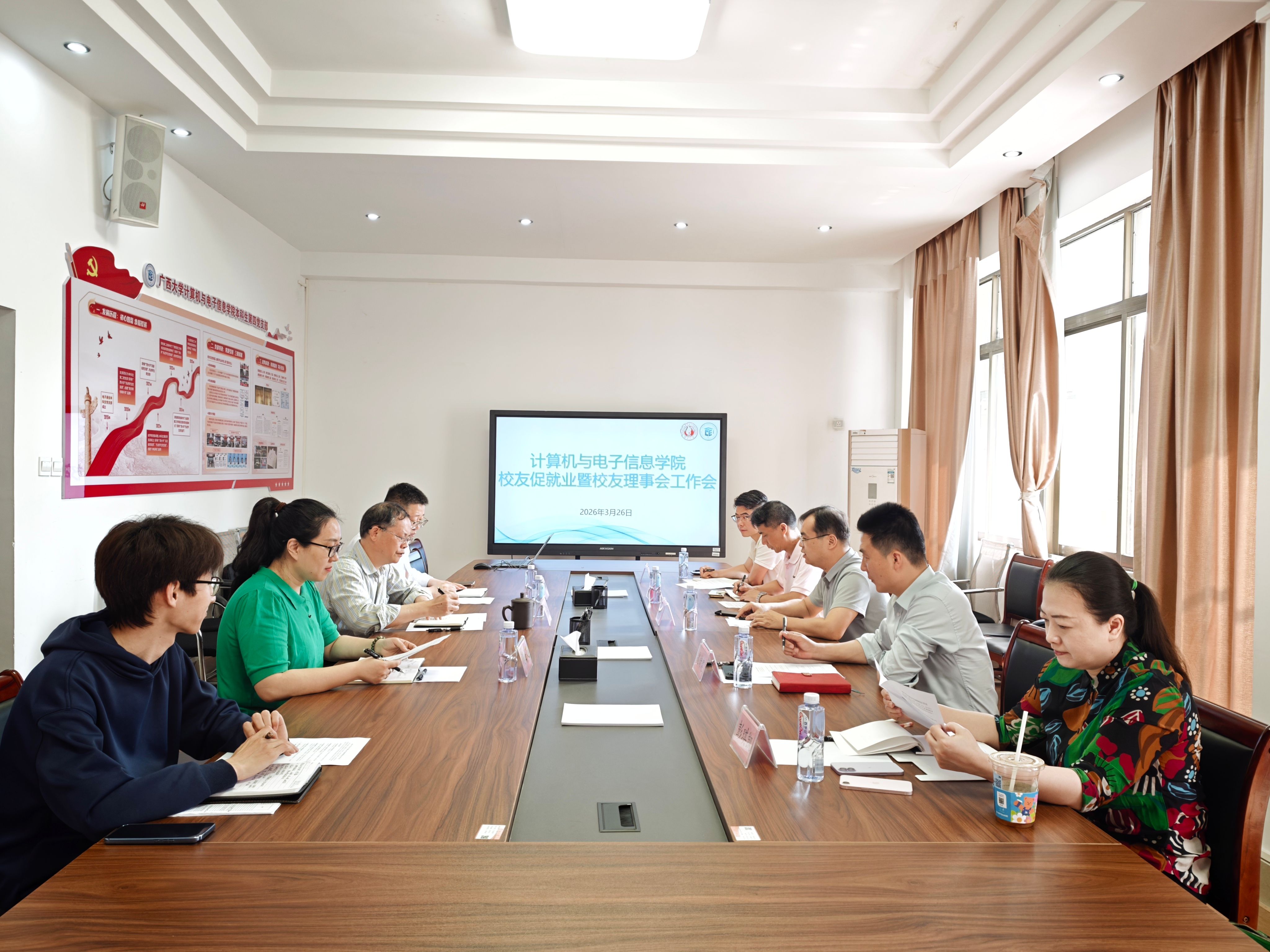 2026年3月26日下午,计算机与电子信息学院校友促就业暨校友会工作会议在学院213会议室顺利召开。我院党委书记赵进创、院长张振荣、党委副书记夏士岚、辅导员胡刚,我院校友会会长吴小奕、常务副会长魏绪建、副会长彭琪凯、副会长梁成龙、秘书长原理等出席座谈会。