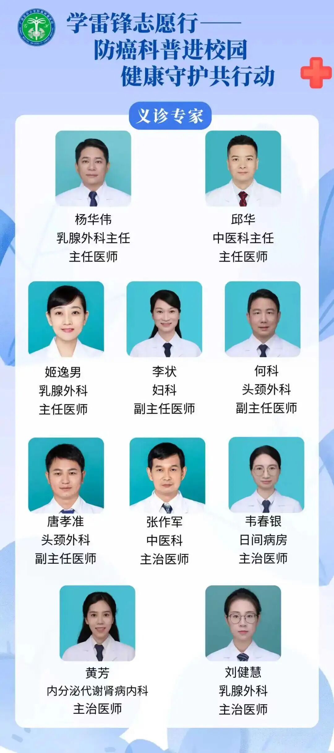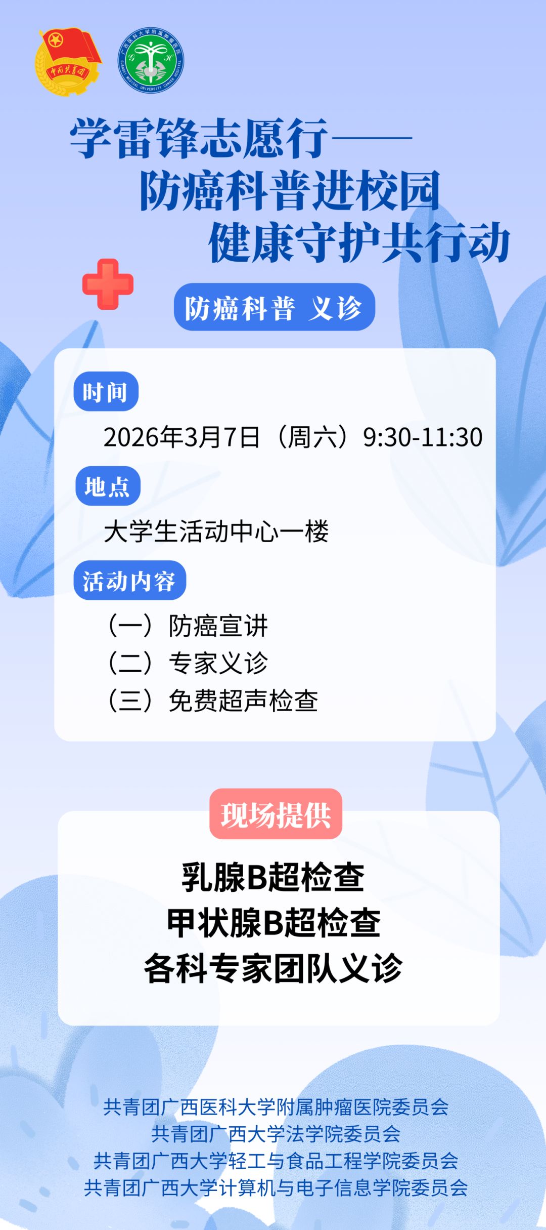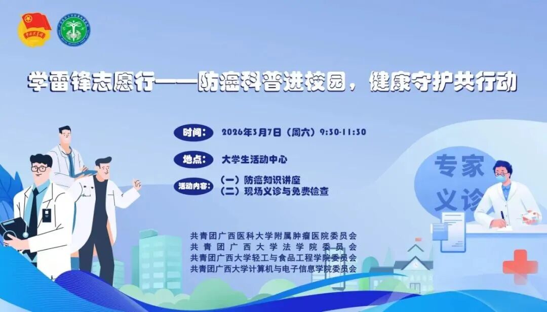 为进一步弘扬雷锋精神,提升大学生健康防护意识,普及癌症防治、食品安全、卫生法律及网络健康信息安全等知识,共青团广西大学轻工与食品工程学院委员会、共青团广西大学法学院委员会、共青团广西大学计算机与电子信息学院委员会,联合共青团广西医科大学附属肿瘤医院委员会,将于2026年3月7日开展“学雷锋 志愿行--防癌科普进校园,健康守护共行动”主题公益活动。