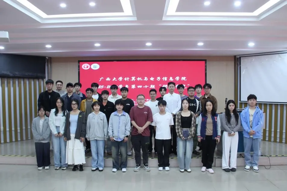 2025年11月6日下午,在共青团广西大学委员会的指导下,广西大学研究生会主办,计算机与电子信息学院研究生会承办的第四十期“研途星光”主题沙龙活动在学院214报告厅顺利举办。本次活动邀请了23级人工智能专业硕士研究生刘少林同学及24级计算机技术专业硕士研究生梁傲雪同学进行经验分享,活动由我院研究生会成员王浩森同学主持。
