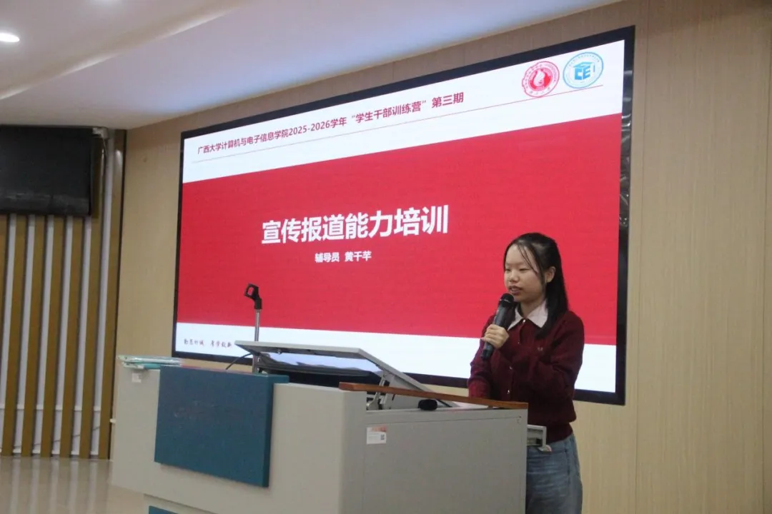 2025 年 11 月 11 日上午,广西大学计算机与电子信息学院 2025-2026 学年 “学生干部训练营” 第三期培训活动在学院 214 报告厅圆满开展。本次培训聚焦学生干部宣传报道核心能力提升,特邀学院辅导员黄千芊老师担任主讲嘉宾,全体参训学生干部参与学习。