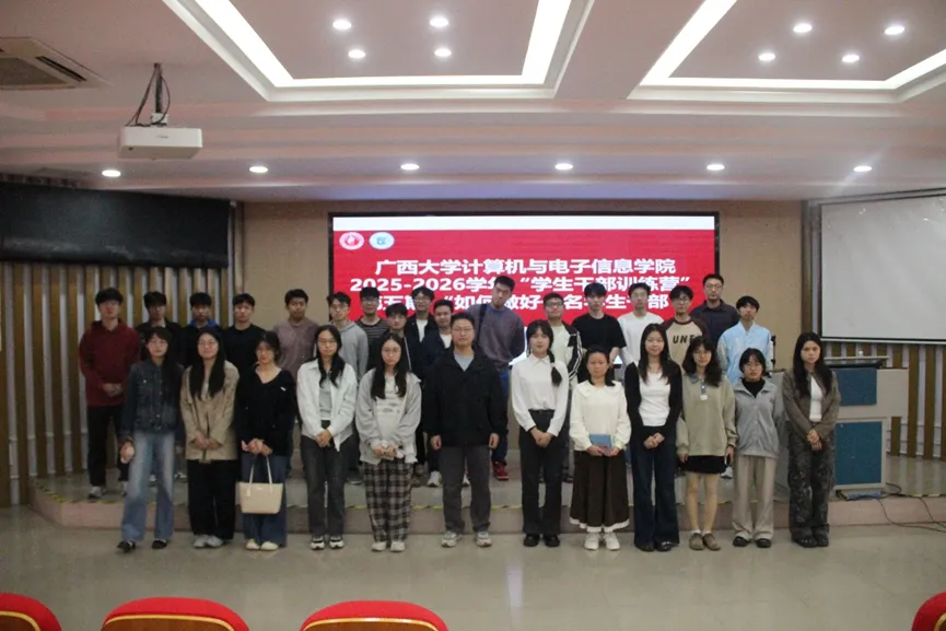 2025年11月11日上午,广西大学计算机与电子信息学院研究生会在学院214报告厅成功举办了“学生干部训练营”第五期培训——如何做好一名学生干部。本次活动旨在帮助同学们清晰认知学生干部的职责与价值,掌握工作方法与技巧,激发服务集体、锻炼自我的热情。活动特邀我院辅导员林文潮老师担任主讲嘉宾,由我院研究生会成员阮梅琳同学主持。